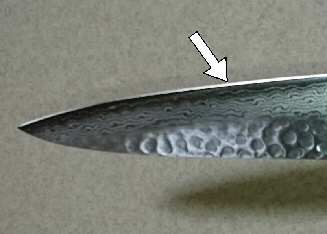 | 砥石に触れるのは、↑この光っている幅1mmくらいの部分だけです。 研ぎ角度を一定に保ち、この幅1mmくらいの箇所を集中的に研ぐことで早く良い刃を付けることができ、またダマスカス包丁の特徴でもある美しい積層模様に傷を付ける事もありません。 |